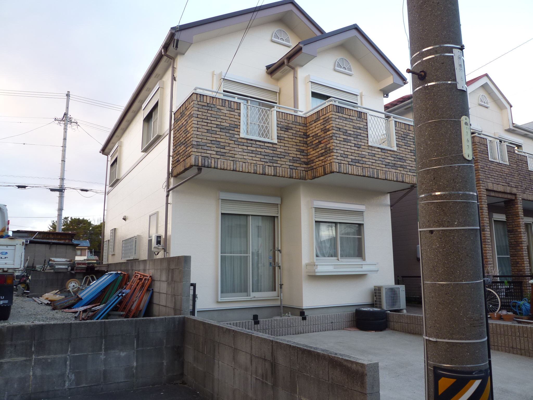 息子が、通った自動車学校の、先生の自宅です。 屋根 壁 他全箇所の塗装工事です。 屋根も 壁も 劣化がそんなになく、すむうずに行きました。 ただ 両隣が狭く少し苦労しました。 ベランダの床(FRP)防水の一部が割れがあり 補修して トップ仕上げの追加工事をしました。 大変綺麗になりました。