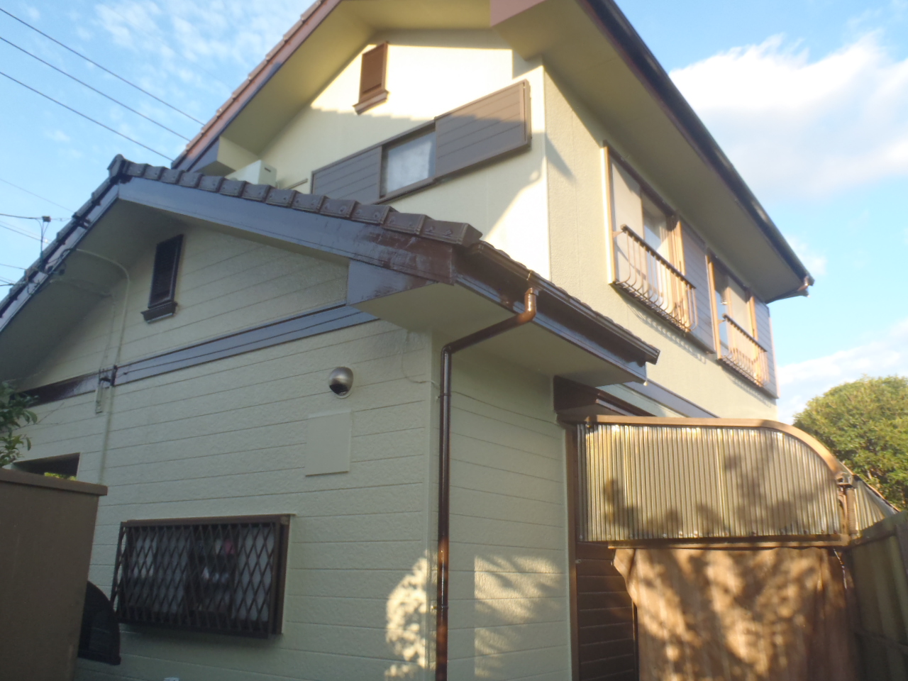 工務店様の弟さんの所の塗装工事を行いました。外壁 ベランダ 屋上の防水工事その他全部所の外装塗装工事を致しました。建物の両隣が大変狭く特に東側 が狭く大変苦労しましたが、仕上がりも、色のバランスも良く綺麗綺麗になったと思います。有り難うございました。