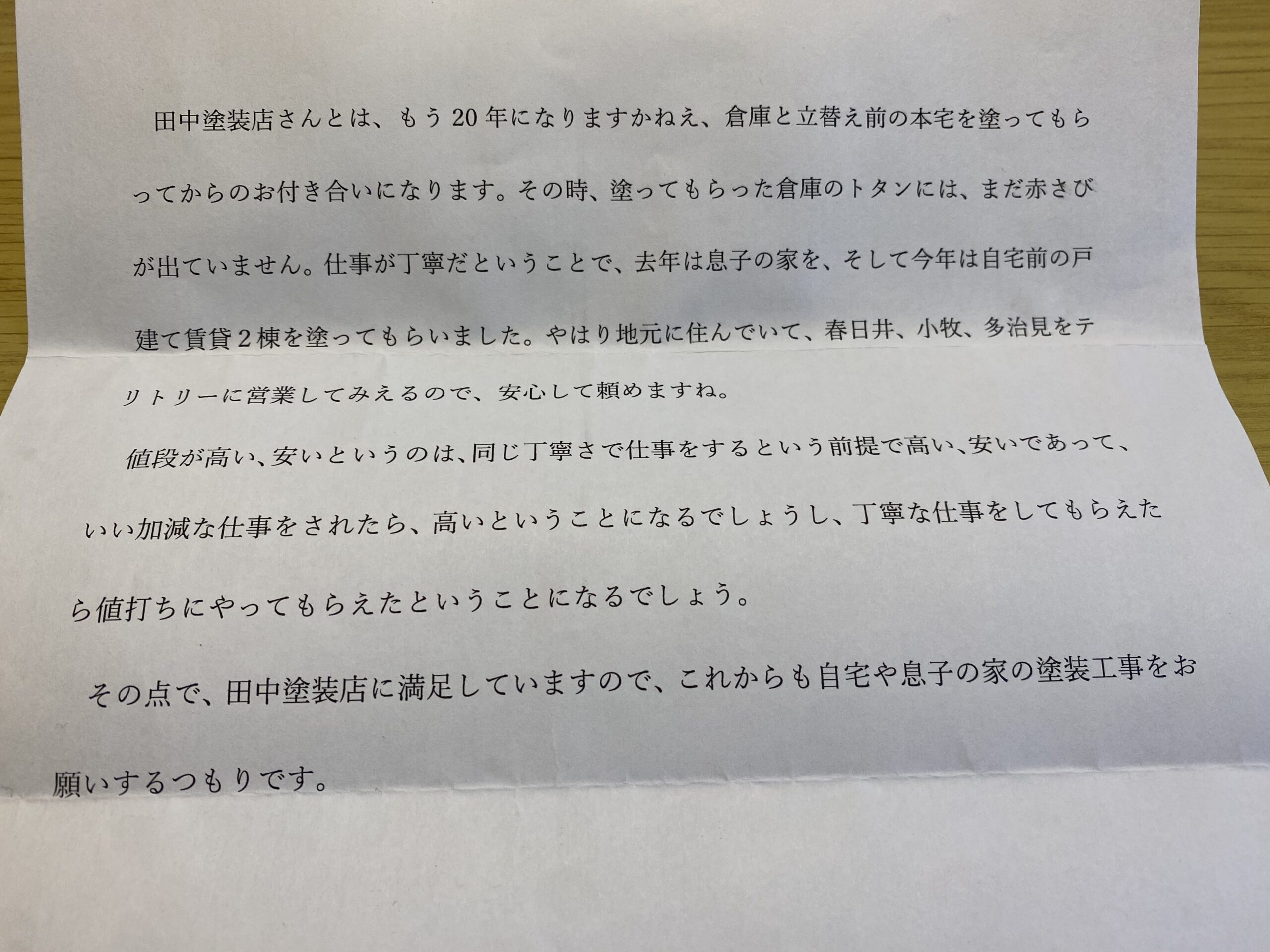 田中塗装店です。 去年は、息子さんの自宅の塗装工事を行いました。 今年は、借家2軒の塗装工事をいただきまして 約20年前は、大家さんの自宅の塗装工事させて頂きました。 それが最初でした。こんなに長い間信用していただき 大変ありがたく思います。 大家さんは、はっきりされて、きもちのいい方です。 コメントまでいただき大変有り難うございました。 これからも宜しくお願い致します。