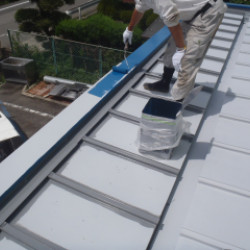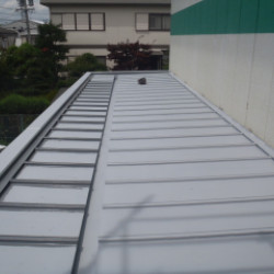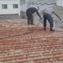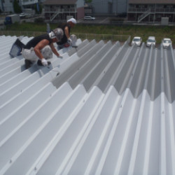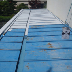 工務店さんの、仕事です。 事務所の、屋根塗装工事です。 水洗い 錆止め 屋根専用シリコン樹脂 3回塗りです。 錆は、ひどいのですが浮き部分は、ほとんど無かったので 思ったよりは、すむうずに塗れました。